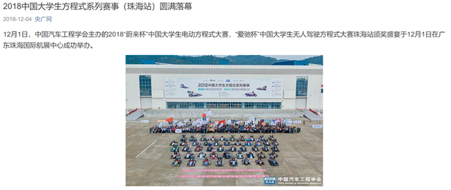 12月1日,中國汽車工程學會主辦的2018“蔚來杯”中國大學生電動方程式大賽,“愛馳杯”中國大學生無人駕駛方程式大賽珠海站頒獎盛宴于12月1日在廣東珠海國際航展中心成功舉辦。