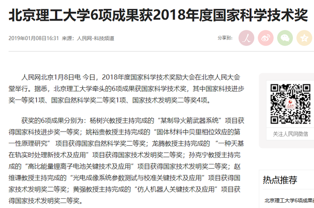 【人民網(wǎng)】北京理工大學(xué)6項(xiàng)成果獲2018年度國(guó)家科學(xué)技術(shù)獎(jiǎng)