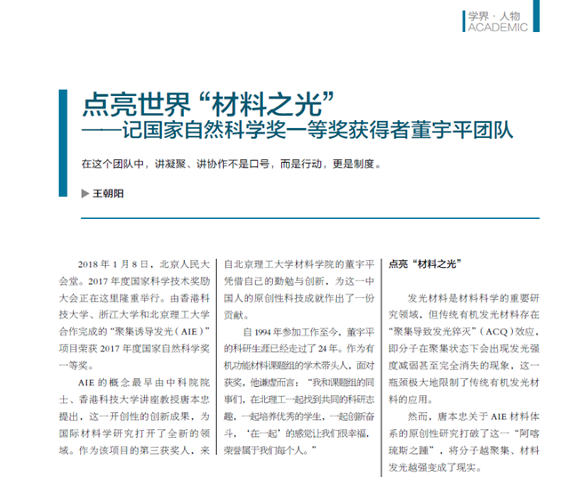 AIE的概念最早由中科院院士、香港科技大學(xué)講座教授唐本忠提出,這一開創(chuàng)性的創(chuàng)新成果,為國際材料學(xué)研究打開了全新的領(lǐng)域。作為該項(xiàng)目的第三獲獎(jiǎng)人,來自北京理工大學(xué)材料學(xué)院的董宇平憑借自己的勤勉與創(chuàng)新,為這一中國人的原創(chuàng)性科技成就作出了一份貢獻(xiàn)。