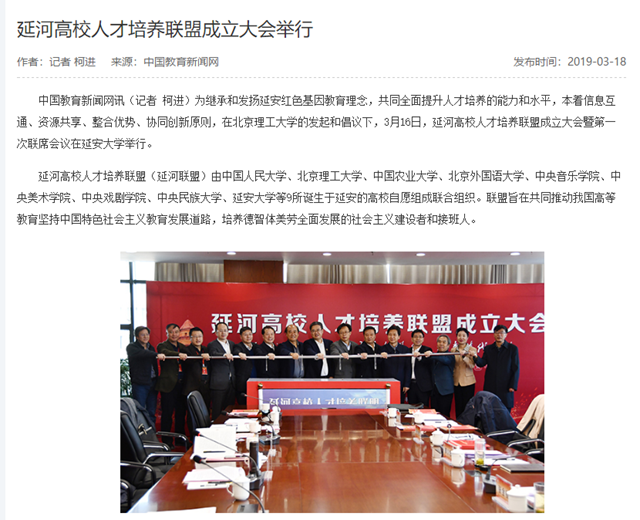 為繼承和發(fā)揚(yáng)延安紅色基因教育理念,共同全面提升人才培養(yǎng)的能力和水平,本著信息互通、資源共享、整合優(yōu)勢(shì)、協(xié)同創(chuàng)新原則,在北京理工大學(xué)的發(fā)起和倡議下,3月16日,延河高校人才培養(yǎng)聯(lián)盟成立大會(huì)暨第一次聯(lián)席會(huì)議在延安大學(xué)舉行。