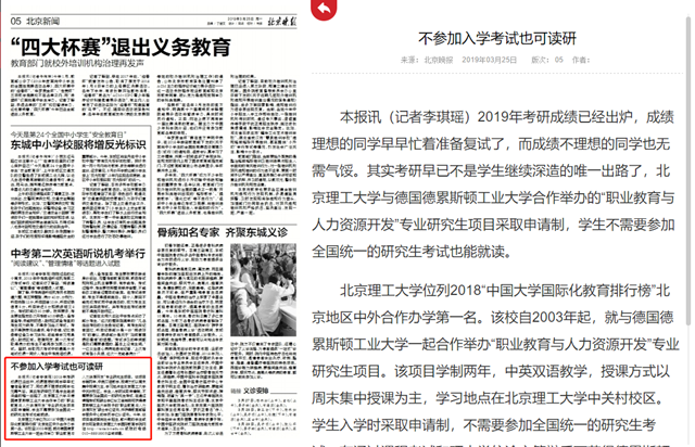 2019年考研成績已經(jīng)出爐,成績理想的同學(xué)早早忙著準(zhǔn)備復(fù)試了,而成績不理想的同學(xué)也無需氣餒。其實(shí)考研早已不是學(xué)生繼續(xù)深造的唯一出路了,北京理工大學(xué)與德國德累斯頓工業(yè)大學(xué)合作舉辦的“職業(yè)教育與人力資源開發(fā)”專業(yè)研究生項(xiàng)目采取申請(qǐng)制,學(xué)生不需要參加全國統(tǒng)一的研究生考試也能就讀。