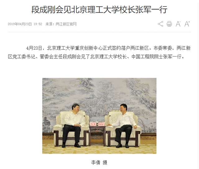 【兩江新區(qū)官網(wǎng)】段成剛會見北京理工大學校長張軍一行