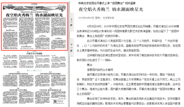 4月28日20時(shí),2019年中國北京世界園藝博覽會(huì)拉開帷幕。開幕式演出以40分鐘舞臺(tái)表演和近3分鐘焰火表演形成一場園林情景光影藝術(shù)的表演盛宴,給觀眾留下了“田園中有舞臺(tái) 舞臺(tái)上有田園”的美好印象。