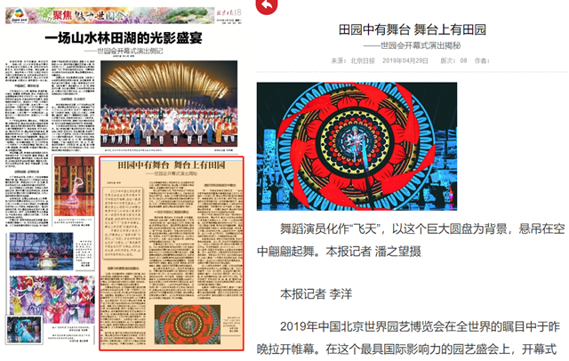 2019年中國(guó)北京世界園藝博覽會(huì)在全世界的矚目中于昨晚拉開(kāi)帷幕。在這個(gè)最具國(guó)際影響力的園藝盛會(huì)上,開(kāi)幕式演出以短短40分鐘舞臺(tái)表演和近3分鐘焰火表演形成一場(chǎng)園林情景光影藝術(shù)表演盛宴,給現(xiàn)場(chǎng)和電視機(jī)前的觀眾留下了“田園中有舞臺(tái),舞臺(tái)上有田園”的美好印象。