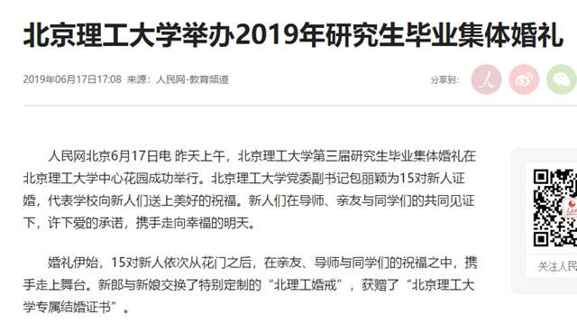 【人民網】北京理工大學舉辦2019年研究生畢業(yè)集體婚禮