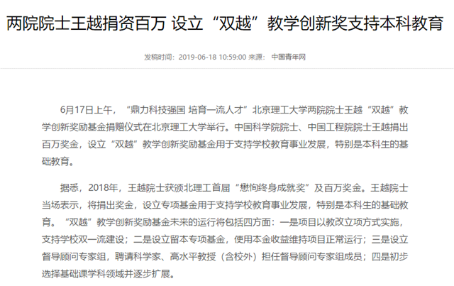 【中國青年網(wǎng)】兩院院士王越捐資百萬 設(shè)立“雙越”教學(xué)創(chuàng)新獎(jiǎng)支持本科教育