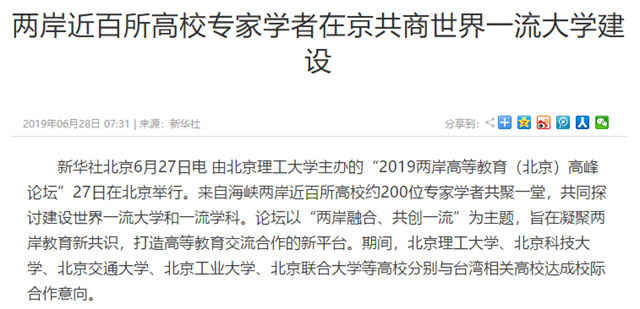 由北京理工大學(xué)主辦的“2019兩岸高等教育(北京)高峰論壇”27日在北京舉行。來自海峽兩岸近百所高校約200位專家學(xué)者共聚一堂,共同探討建設(shè)世界一流大學(xué)和一流學(xué)科。論壇以“兩岸融合、共創(chuàng)一流”為主題,旨在凝聚兩岸教育新共識,打造高等教育交流合作的新平臺。期間,北京理工大學(xué)、北京科技大學(xué)、北京交通大學(xué)、北京工業(yè)大學(xué)、北京聯(lián)合大學(xué)等高校分別與臺灣相關(guān)高校達(dá)成校際合作意向。