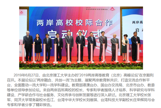 2019年6月27日,由北京理工大學(xué)主辦的“2019兩岸高等教育(北京)高峰論壇”在京順利召開(kāi)。本屆論壇以“兩岸融合、共創(chuàng)一流”為主題,凝聚兩岸教育新共識(shí),打造交流合作新平臺(tái),全面推動(dòng)一流大學(xué)和一流學(xué)科建設(shè)。教育部港澳臺(tái)辦、國(guó)臺(tái)辦交流局、北京市臺(tái)辦、教委等單位領(lǐng)導(dǎo)參加論壇。來(lái)自?xún)砂栋偎咝5男iL(zhǎng)、專(zhuān)家和學(xué)者圍繞人才培養(yǎng)、科學(xué)研究與學(xué)科建設(shè)、產(chǎn)學(xué)研合作與社會(huì)服務(wù)、文化傳承與創(chuàng)新發(fā)展等進(jìn)行深入研討。北京理工大學(xué)校長(zhǎng)張軍、同濟(jì)大學(xué)常務(wù)副校長(zhǎng)伍江、臺(tái)灣中華大學(xué)校長(zhǎng)劉維琪、臺(tái)灣科技大學(xué)副校長(zhǎng)莊榮輝同與會(huì)專(zhuān)家和學(xué)者分享了精彩報(bào)告。