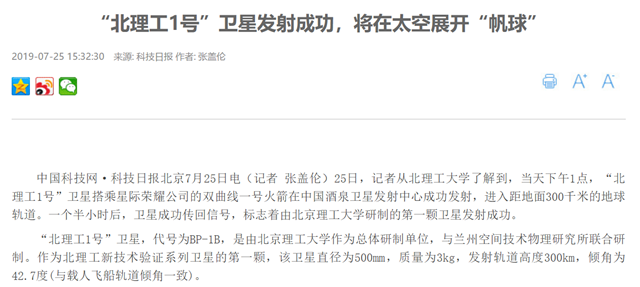 【中國(guó)科技網(wǎng)】“北理工1號(hào)”衛(wèi)星發(fā)射成功,將在太空展開(kāi)“帆球”