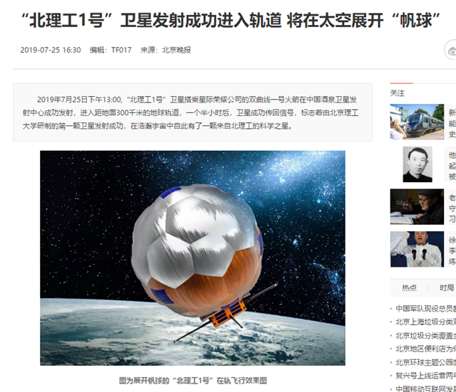 【北晚新視覺】“北理工1號”衛(wèi)星發(fā)射成功進入軌道 將在太空展開“帆球”