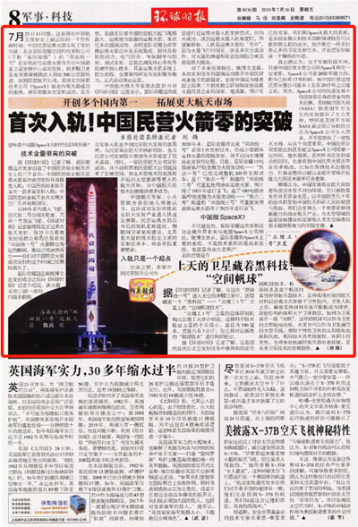 據(jù)《環(huán)球時(shí)報(bào)》記者了解,星際榮耀這次發(fā)射創(chuàng)造了中國(guó)民營(yíng)商業(yè)航天歷史上的三個(gè)首次:中國(guó)民營(yíng)商業(yè)航天運(yùn)載火箭首次成功發(fā)射并高精度入軌;中國(guó)民營(yíng)商業(yè)航天首次一箭多星發(fā)射入軌;中國(guó)民營(yíng)商業(yè)航天首次實(shí)現(xiàn)太空廣告并視頻回傳。