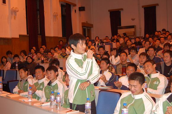 金志揚教授在報告中講述了自己與北京理工大學合作的淵源,以及校足球隊成長的歷史與一些感人的細節(jié),在北京理工大學足球隊勝利沖甲的同時,他也完成了自己的“體育回歸教育”的探索與實踐,為中國足球事業(yè)的發(fā)展和大學生體育事業(yè)的發(fā)展都寫下了濃重的一筆。金志揚教授用極具鮮明個性的語言和跌宕起伏的內(nèi)心感受打動了在場所有聽眾的心,掌聲一次又一次的熱烈響起,為“金指”的人品、修養(yǎng)和敢于探索的精神喝彩!