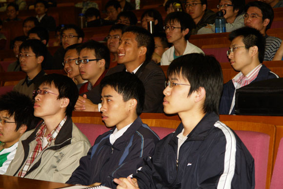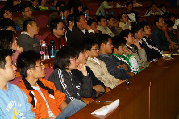 董路先生到場(chǎng)后,風(fēng)趣幽默的開場(chǎng)白立刻調(diào)動(dòng)了大家的興趣。當(dāng)他說(shuō)到“我習(xí)慣在別人懷疑的目光中證明我自己的想法!”時(shí),大家感到了一種昂揚(yáng)的精神,不禁大聲鼓起掌來(lái)。