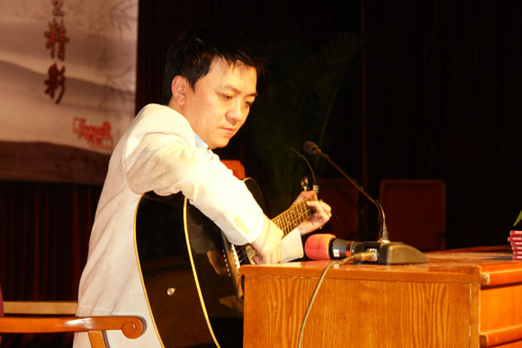 在董先生演講結(jié)束之前,他特地為我們彈奏了一曲吉他,并親自演唱了自創(chuàng)歌曲《在你向我微笑的一瞬間》,嗓音很有質(zhì)感,感情很真摯!