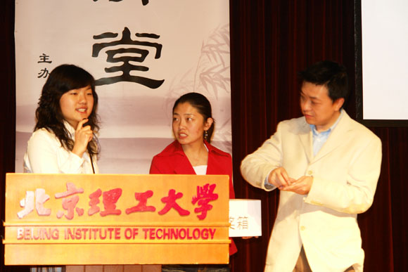 精彩的演講不時(shí)贏得大家熱烈的掌聲。在提問(wèn)環(huán)節(jié),同學(xué)們踴躍提問(wèn),闡述自己的觀點(diǎn),董先生都友善而風(fēng)趣的予以回答。最后,由董路先生抽出了本場(chǎng)講座的幸運(yùn)觀眾,獲得由董路先生簽名的個(gè)人CD和北京愛國(guó)者大學(xué)生足球隊(duì)中甲北理首次主場(chǎng)(本月21日)的入場(chǎng)券。