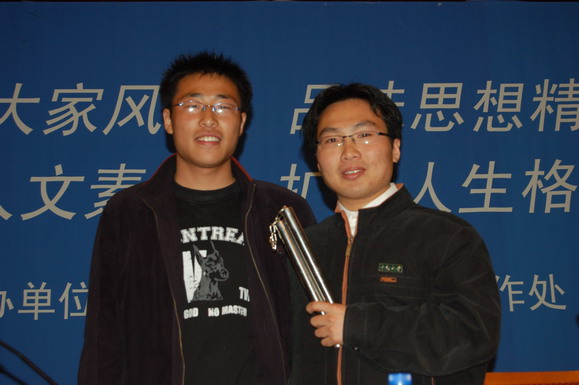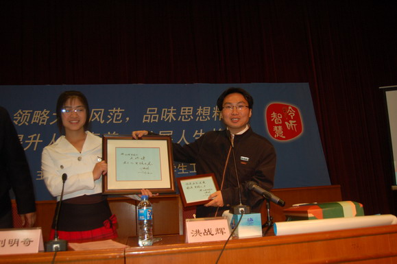 學(xué)生工作部部長劉明奇代表學(xué)校把一些具有學(xué)校特色的紀念品和講座的海報贈送給了洪戰(zhàn)輝同學(xué)。同時,洪戰(zhàn)輝同學(xué)也為我校自強社準備了一份小禮物。由他親筆題寫的一幅硬筆書法作品,內(nèi)容是“天行健,君子以自強不息 與北京理工大學(xué)自強社同學(xué)共勉”