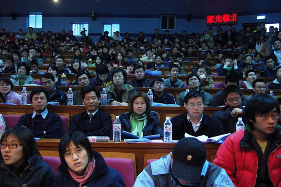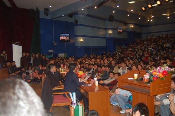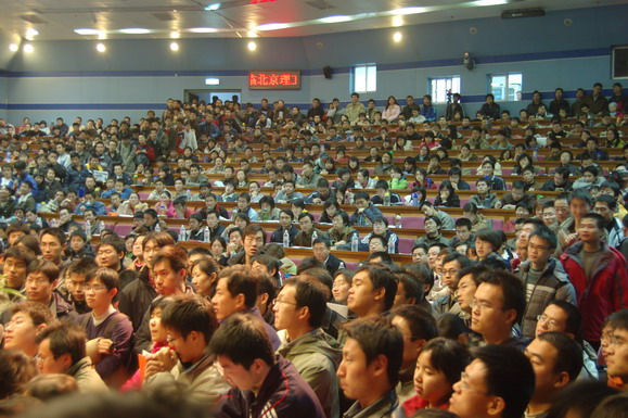 學(xué)生工作部早在報(bào)告會(huì)開始一周前就通過網(wǎng)站、論壇、海報(bào)、噴繪等多種形式對(duì)本次報(bào)告會(huì)展開了大規(guī)模宣傳,使這場(chǎng)報(bào)告會(huì)受到了同學(xué)們的廣泛關(guān)注。在報(bào)告會(huì)開始前6個(gè)小時(shí)就有同學(xué)來(lái)到會(huì)場(chǎng)等候,報(bào)告會(huì)開始前一個(gè)小時(shí)所有座位都坐滿了觀眾,過道和講臺(tái)上都擠滿了熱情的聽眾。