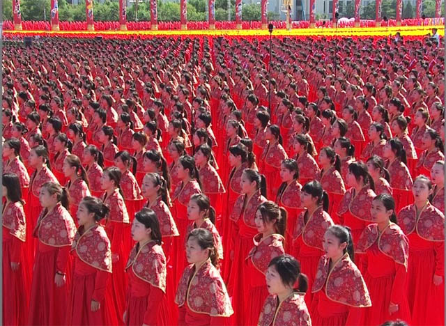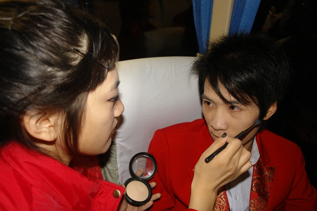 為了達到最佳表演效果,在去往廣場的路上,許多生平從未化過妝的男同學(xué)在女同學(xué)的幫助下迅速地面貌一新。