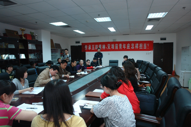 大家熱烈討論了在災(zāi)難面前,一部分青年人所表現(xiàn)出的“旁觀者”的心態(tài)。同學(xué)們對(duì)于“拔一毛而利天下不為也”的言論進(jìn)行了理性的思考和分析,材料學(xué)院的魏賽同學(xué)認(rèn)為,“五四精神是一種敢為天下先的精神,雖然我們每個(gè)人的力量是微薄的,但是在我們的帶動(dòng)下會(huì)有更多的人加入到對(duì)抗災(zāi)難的行動(dòng)中,青年特別是團(tuán)學(xué)骨干要有能力通過自己的行動(dòng)有效的引導(dǎo)和帶動(dòng)身邊更多的人做正確而有意義的事情。”