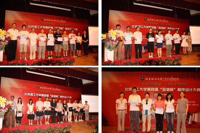 在激昂的音樂聲中,亞信集團股份有限公司副總裁李捷先生宣讀了獲北京理工大學第四屆“亞信杯”程序設計大賽一等獎的同學名單,丁院長和李捷先生一同為獲獎選手代表頒發(fā)了證書和獎杯。北京理工大學教務處副處長宣讀了獲第四屆“亞信杯”程序設計大賽二等獎的同學名單,網(wǎng)絡服務中心主任陳朔鷹老師宣讀了獲第四屆“亞信杯”程序設計大賽三等獎的同學名單,軟件學院機關辦公室主任孟春老師宣布了獲得最佳女隊獎和最佳勇氣獎的選手名單,亞信集團股份有限公司季青老師公布參與此次比賽工作的優(yōu)秀志愿者、優(yōu)秀組織干部名單,在場領導為獲獎選手代表頒發(fā)了證書、獎杯。