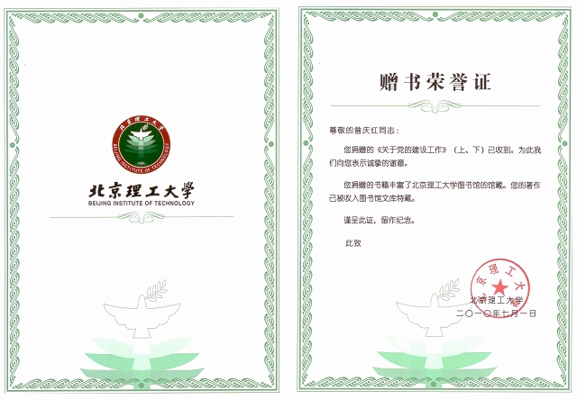 我校圖書館接受贈(zèng)書并將此次贈(zèng)書作為圖書館文庫特藏,同時(shí)向曾慶紅同志呈送了贈(zèng)書榮譽(yù)證。