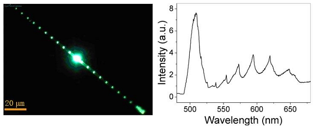 在這個工作中,該團隊的代國章博士后采用一種簡單可控的微區(qū)CVD方法實現(xiàn)了一維的光子超晶格結(jié)構(gòu),主要是II-VI族CdS/CdS:SnS2微米線的生長。這種微米線受光激發(fā)后能夠產(chǎn)生非常完美的周期性發(fā)光,且發(fā)光的周期可以通過改變超晶格分段的長度實現(xiàn)調(diào)控,光子限域的特征十分完美。其簡單的合成方法與材料在光(子)學(xué)響應(yīng)的的結(jié)果在國際上首次報道。該成果對降低微型固態(tài)激光器的激發(fā)閾值、實現(xiàn)新型光波導(dǎo)、光開關(guān),研究激子與光的相互作用具有重要的意義。