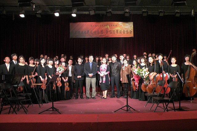 音樂會最后,我校學生合唱團的同學們又一起演唱了由合唱團藝術指導賀春華教授與同學們一起根據(jù)我校校友曾慶紅創(chuàng)作的《獻給母校的歌,送給師長的花》把晚會推向新的高潮。這首詩歌是曾慶紅為我校建校60周年時而作,作者感情深厚的表達了自己對學校的崇敬之情,“在戰(zhàn)火紛飛中成長壯大,窯洞中培育出我黨第一代理工人才,身披共和國誕生的霞光異彩,胸懷為國防事業(yè)奉獻的豪邁!得天獨厚的北京首都迅猛發(fā)展,建成人才培養(yǎng)與國防科研的國家品牌。生我者父母,育我者校園-----”。同學們深情的演唱打動了在場的每一位觀眾,排練這首作品時老師曾經(jīng)在分析作品表達時有的學生因為感動而哽咽。這就是藝術作品所給予人們的許多意想不到的震撼與力量。
