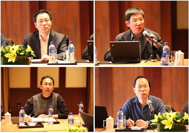 中央編譯局副局長魏海生(左上)出席會議并講話;中央編譯局馬列主義文獻信息部主任郗衛(wèi)東(右上)講話;北京理工大學計算機學院黨委書記郭彥懿(左下)講話;北京理工大學計算機學院牛振東副院長(右下)主持會議。