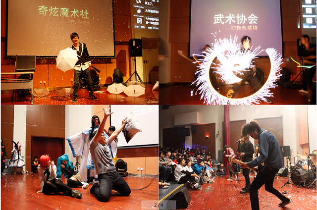 大學(xué)道晚會淡化了以往晚會中主持人的作用,通過電影剪輯串場的方式,將各社團的節(jié)目緊密相連并緊扣“諾亞方舟——愛的港灣”主題,為同學(xué)們帶來了一場精彩絕倫的視聽盛宴。晚會在獨立音協(xié)的精彩表演中拉開了帷幕,此后奇炫魔術(shù)社的魔術(shù)表演、太陽劇社的話劇《變身男女》、武術(shù)協(xié)會的雙節(jié)棍表演、黑白動漫社的cosplay、鄉(xiāng)琴的原創(chuàng)歌曲把晚會推向高潮。、