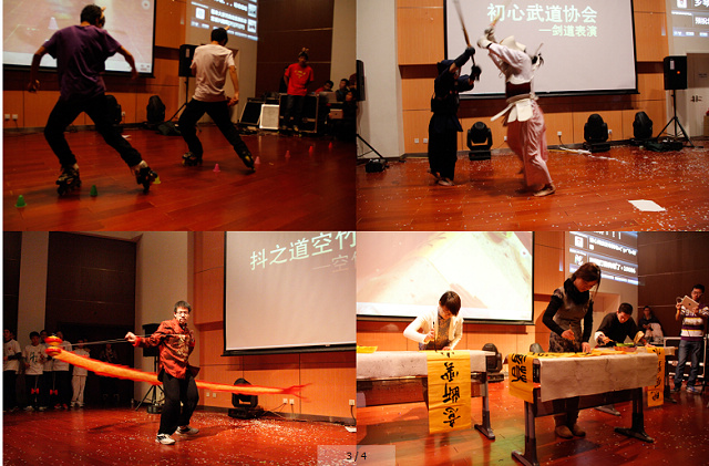 跆拳道的功夫秀顯示出其成員的深厚功力,無陽齋充滿意境的表演將音樂與書法融合起來,悅音唯美動人的演唱也讓臺下的觀眾連連叫好。還有酷愛輪滑社技藝精湛的表演、劍道社令人振奮的劍道展示、抖之道空竹社的絕妙演出、龍藝社與無陽齋書畫社的中國風(fēng)、BIT Crew街舞社動感十足的舞蹈更是點燃了晚會現(xiàn)場的氣氛。