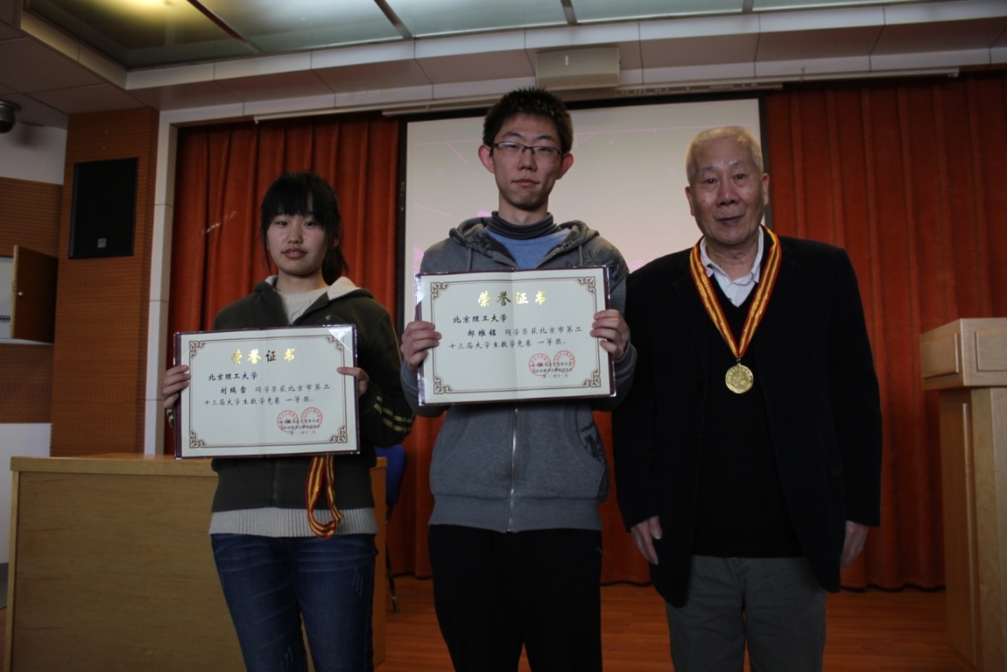 大會開始時,基礎教育學院副院長程杞元教授宣讀了獲獎名單。在本屆全國大學生數學競賽中,我校學子喜傳佳績,獲得驕人的成績,共有36名學生榮獲市級獎項,其中劉雪瑞同學尤為出色,成為北京賽區(qū)晉級全國賽的16名選手之一,最終獲得全國大學生數學競賽總決賽三等獎,實現了我校參加全國大學生數學總決賽零的突破。林群院士親自為她頒獎,并合影留念。