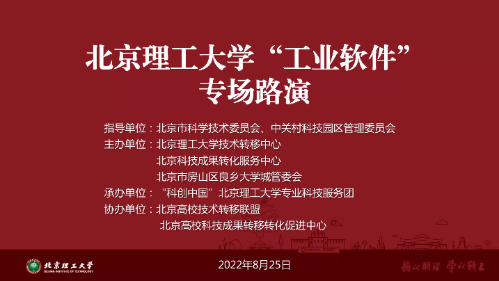8月25日下午,北京理工大學(xué)“工業(yè)軟件”專場路演活動舉行。本次活動在北京市科委、中關(guān)村管委會的支持和指導(dǎo)下,由北理工技術(shù)轉(zhuǎn)移中心、北京科技成果轉(zhuǎn)化服務(wù)中心和北京市房山區(qū)良鄉(xiāng)大學(xué)城管委會聯(lián)合主辦。路演采取線上線下相結(jié)合的方式,受到社會各界廣泛關(guān)注。