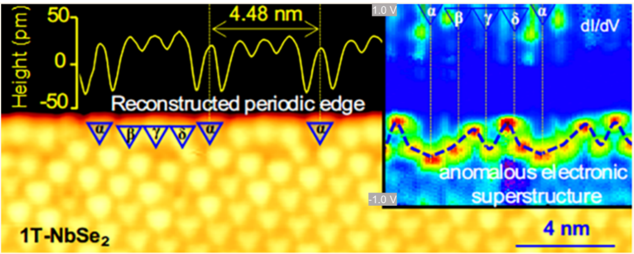 利用分子束外延(MBE)技術(shù)構(gòu)筑了原子級平整邊界,發(fā)現(xiàn)邊界處的CDW元胞由體內(nèi)有序的CDW晶格自發(fā)地演化重構(gòu)成四聚體。此外,還發(fā)現(xiàn)沿邊界出現(xiàn)了反常的電子超結(jié)構(gòu),其周期是普通CDW晶格的4倍。每個周期由4個不等價CDW組成,并呈現(xiàn)由結(jié)構(gòu)調(diào)制的相應(yīng)電子態(tài)超結(jié)構(gòu),實現(xiàn)了對自旋陣列尺寸和維度的深入調(diào)控。