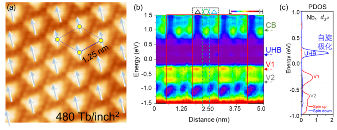 軌道之間的空間反相分布關(guān)系,測量并闡明了單層1T-NbSe2每個CDW格點在UHB態(tài)的能量具有自旋極化特性,可作為低功耗的信息存儲點。信息點間距為1.25nm,自旋信息存儲密度高達480 Tb/inch2 (每平方英寸480兆兆比特)。