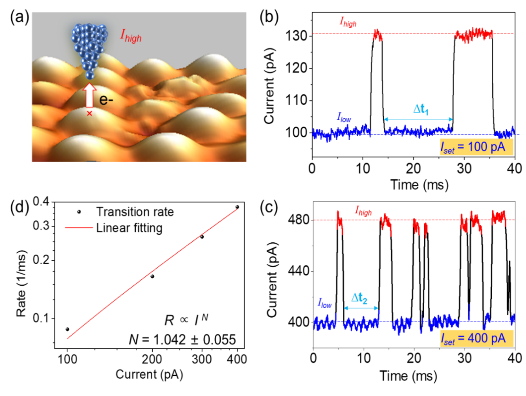 圖1. 利用單電子隧穿實現(xiàn)了CDW陣列雙穩(wěn)態(tài)可逆轉(zhuǎn)變。(a)CDW陣列在電流驅(qū)動下轉(zhuǎn)變的示意圖。(b, c)電流-時間譜線顯示轉(zhuǎn)變瞬間的高低電流變化,大的電流驅(qū)動使得雙穩(wěn)態(tài)轉(zhuǎn)變更快。(d)電流-時間譜線統(tǒng)計擬合,滿足隧穿電流與轉(zhuǎn)變幾率的線性關(guān)系,證明了單電子隧穿過程。