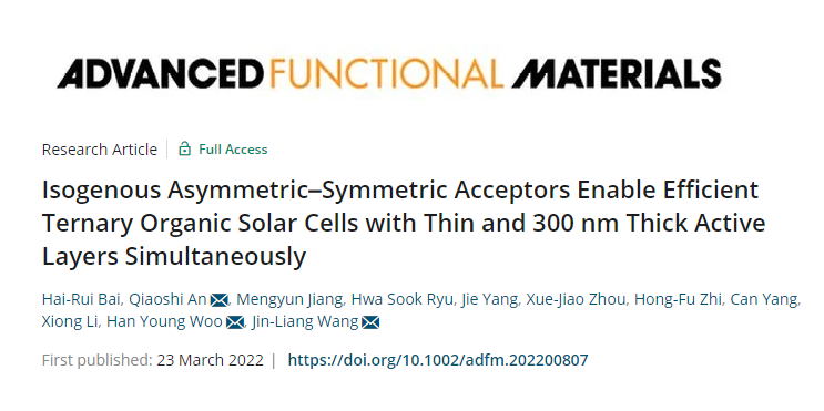 近日,北理工王金亮教授團隊在構(gòu)筑高效三元有機太陽能電池方面取得進展,相關(guān)研究成果發(fā)表于國際材料領(lǐng)域著名學術(shù)期刊《Advanced Functional Materials》上,題為“Isogenous Asymmetric-Symmetric Acceptors Enable Efficient Ternary Organic Solar Cells with Thin and 300 nm Thick Active Layers Simultaneously”?;瘜W與化工學院博士研究生白海瑞為論文第一作者,王金亮教授、安橋石特別研究員以及Han Young Woo教授(韓國高麗大學)為通訊作者,北京理工大學為第一通訊單位。論文的合作者還包括北京工商大學李熊教授。