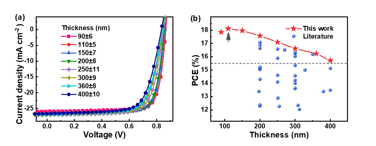 研究結(jié)果顯示,當Y6-1O在受體中的含量為10 wt%時,三元器件最優(yōu)效率達到18.11%,填充因子為79.27%。當器件的活性層厚度增加到300 nm或400 nm時,三元器件仍能保持16.61%或15.71%效率,均為目前已報道同厚度器件效率的最高值。三元器件效率的提升主要歸因于更高效的電荷生成和提取過程,其得益于光子捕獲的增加、能級及形貌的優(yōu)化。該工作結(jié)果表明,將同源非富勒烯受體Y6-1O和Y7-BO相結(jié)合是同時實現(xiàn)高效薄膜和厚膜三元有機太陽能電池的一種有效策略。