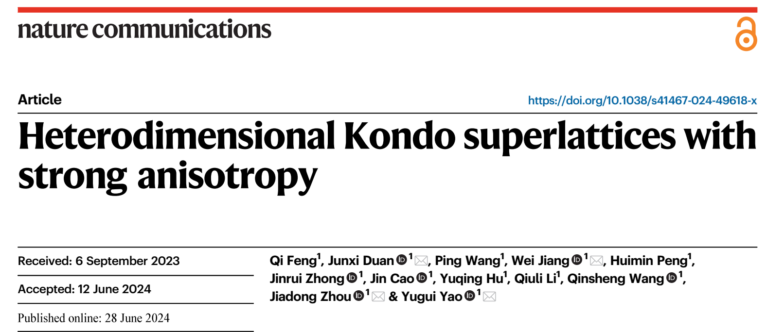 Qi Feng, Junxi Duan*, Ping Wang, Wei Jiang*, Huimin Peng, Jinrui Zhong, Jin Cao, Yuqing Hu, Qiuli Li, Qinsheng Wang, Jiadong Zhou* & Yugui Yao*, “Heterodimensional Kondo superlattices with strong anisotropy”, Nat. Commun. 15, 5491 (2024) (*為通訊作者)