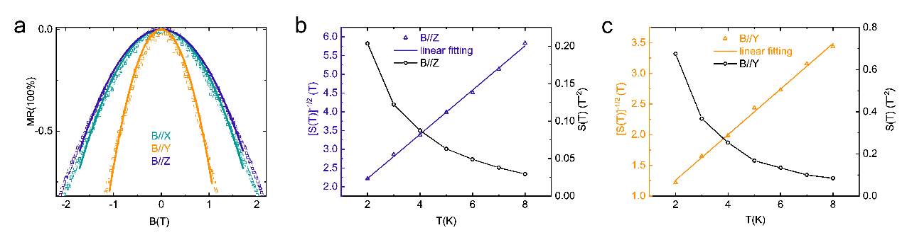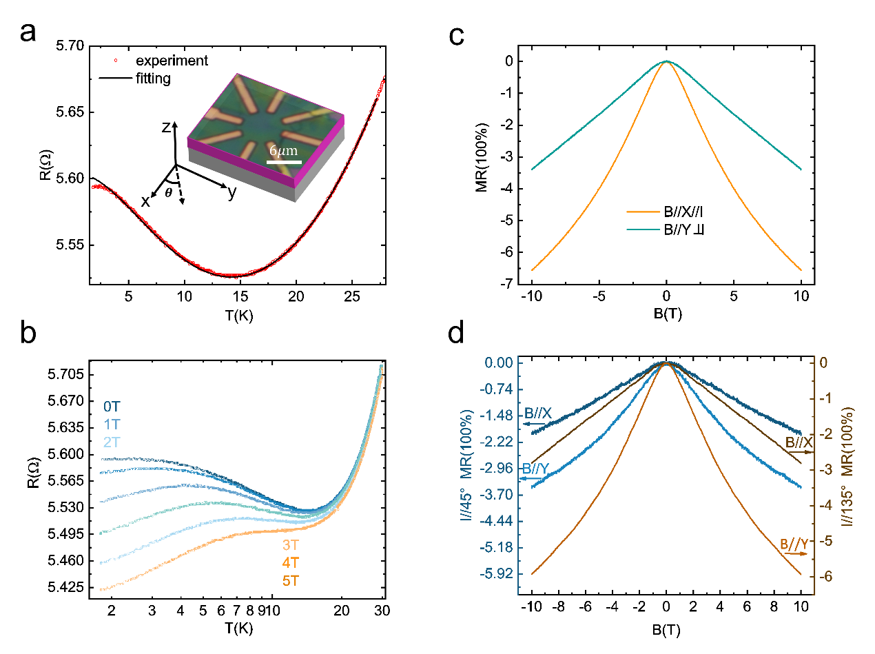 北京理工大學(xué)段俊熙副教授、姚裕貴教授團隊長期致力于新型拓?fù)浜土孔硬牧系妮斶\性質(zhì)研究。為了實現(xiàn)這種異維近藤超晶格,研究團隊選擇了擁有豐富磁學(xué)性質(zhì)的過渡金屬二硫化物VS2- VS異維超晶格作為候選材料。該結(jié)構(gòu)由北京理工大學(xué)的周家東教授最先合成[Nature 609, 46–51 (2022)]。研究中,我們發(fā)現(xiàn):(1)在VS2- VS異維超晶格觀察到了電阻關(guān)于溫度的對數(shù)依賴關(guān)系以及負(fù)磁阻,即近藤效應(yīng)的典型特征。有趣的是這兩者對磁場的依賴關(guān)系表現(xiàn)出強烈的各向異性,如圖1所示;(2)利用圓盤型器件,確定了各向異性的負(fù)磁阻來源于近藤效應(yīng)的各向異性磁場依賴,如圖2所示;(3)通過提取朗德g因子及居里溫度,結(jié)合第一性原理計算,證實了近藤效應(yīng)的各向異性磁場依賴來源于維度引起的各向異性磁性,如圖3所示。