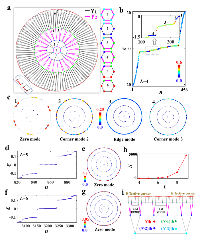 除了一階雙曲量子反?;魻栠吔鐟B(tài),研究人員進(jìn)一步研究了雙曲晶格中的高階零能角態(tài)。所設(shè)計(jì)的雙曲晶格模型顯示在圖3a中,即在{6,4}雙曲晶格中引入二值化(黑線和粉線)的層內(nèi)和層間最近鄰耦合。當(dāng)最外層的耦合強(qiáng)度對應(yīng)于弱耦合時(shí),高階角態(tài)就會產(chǎn)生。需要指出的是,不同于歐氏空間中0維角點(diǎn)的幾何特性,雙曲晶格的有效0維角點(diǎn)對應(yīng)于具有不同耦合方式的最外層格點(diǎn)間的有效界面(如圖3i所示)。圖3b和3c展示了利用數(shù)值對角化方法計(jì)算的雙曲能譜和相應(yīng)本征態(tài)的空間分布??梢钥吹诫p曲零能模的概率分布局域在最外層的0維格點(diǎn)上,展現(xiàn)了高階拓?fù)浣菓B(tài)的特性。同時(shí),除了零能模,在另外兩個(gè)能量附近也存在雙曲高階角態(tài)??梢园l(fā)現(xiàn)與歐氏空間的高階角態(tài)性質(zhì)相似,雙曲高階角態(tài)也總是出現(xiàn)在雙曲邊界態(tài)的帶隙中。研究人員從三個(gè)方面進(jìn)一步對高階零模的拓?fù)湫再|(zhì)進(jìn)行了證明。首先,通過改變二值化耦合強(qiáng)度的相對關(guān)系,雙曲能譜發(fā)生了帶隙閉合再打開的過程。同時(shí),該過程伴隨著雙曲高階零能模從無到有的變化過程,是拓?fù)湎嘧兊闹匾卣?。其次,雙曲高階拓?fù)鋺B(tài)具有與C6-高階拓?fù)浣^緣體相同的拓?fù)湎嘧兲攸c(diǎn)。最后,通過引入無序可以發(fā)現(xiàn)雙曲高階零能角態(tài)具有很強(qiáng)的魯棒性,這與雙曲晶格中由干涉引起的局域化效應(yīng)顯著不同。另外研究人員計(jì)算了不同尺寸下的雙曲能譜和本征態(tài)的分布,如圖3d-3g所示。圖3h給出了雙曲零能模的數(shù)量與雙曲晶格尺寸的關(guān)系??梢钥吹酵ㄟ^增大雙曲晶格的尺寸,雙曲零能模式的數(shù)量也急劇增加。該現(xiàn)象與分形幾何結(jié)構(gòu)中的高階拓?fù)浣菓B(tài)相似。需要強(qiáng)調(diào)的是,這一新奇的現(xiàn)象是源于雙曲晶格獨(dú)特的邊界響應(yīng),即邊界格點(diǎn)的數(shù)目隨雙曲晶格層數(shù)的增加而呈現(xiàn)指數(shù)增長的趨勢,使得邊界有效0維角點(diǎn)也具有指數(shù)增長的特點(diǎn)。