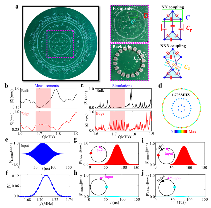 基于凝聚態(tài)晶格模型與電子線路網(wǎng)路的一致性,研究人員設(shè)計(jì)并制備了雙曲電路(如圖2a所示)來觀察邊界統(tǒng)治的雙曲量子反?;魻栃?yīng)。圖2b和2c分別對應(yīng)實(shí)驗(yàn)測量和理論仿真的電路阻抗結(jié)果。電路格點(diǎn)的阻抗響應(yīng)對應(yīng)于雙曲量子模型的局域態(tài)密度??梢钥吹剑p曲體點(diǎn)在紅色區(qū)域內(nèi)沒有阻抗峰值,表明存在雙曲體帶帶隙。同時(shí),雙曲電路的邊界格點(diǎn)在該帶隙中存在顯著的阻抗峰值,表明拓?fù)溥吔鐟B(tài)的存在。圖2d展示的是邊界態(tài)所對應(yīng)頻率下的電路阻抗分布圖??梢钥闯銎渑c雙曲晶格模型中的拓?fù)溥吘墤B(tài)的概率幅分布完全一致。進(jìn)一步,研究人員通過測量電壓波包在雙曲電路網(wǎng)路中的時(shí)域特性,清晰地證明了邊界統(tǒng)治的雙曲邊界電壓傳輸,如圖2e-2j所示。