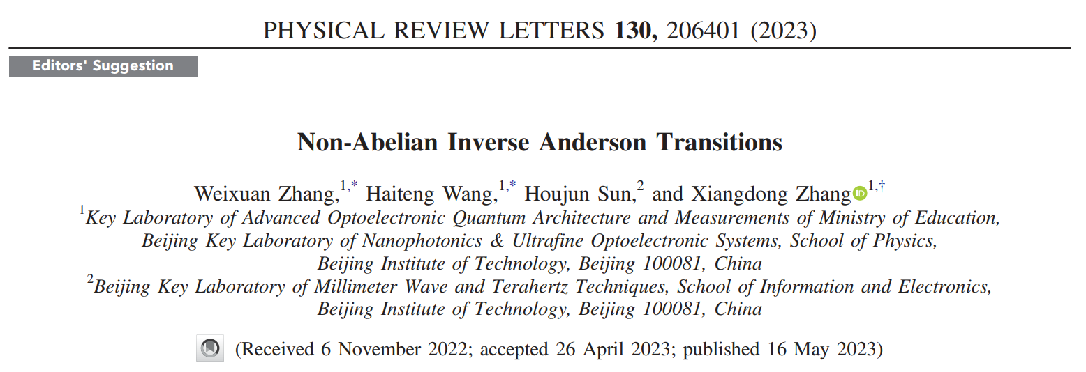非阿貝爾規(guī)范場(chǎng)是楊振寧和羅伯特?米爾斯為了描述核子間相互作用而提出的。最近,人們將有效非阿貝爾規(guī)范場(chǎng)的概念推廣到實(shí)空間和各種參數(shù)空間,揭示了眾多具有非阿貝爾特性的新奇物理現(xiàn)象,如非阿貝爾AB效應(yīng),非阿貝爾拓?fù)鋺B(tài)和非阿貝爾平帶局域化等。因此,進(jìn)一步探究逆安德森相變和非阿貝爾規(guī)范場(chǎng)的相互作用,揭示具有非阿貝爾特性的新奇無(wú)序物態(tài),是具有重要意義的研究課題。另外,如何實(shí)驗(yàn)構(gòu)造復(fù)雜的非阿貝爾無(wú)序系統(tǒng),也是亟待解決的重要問(wèn)題。