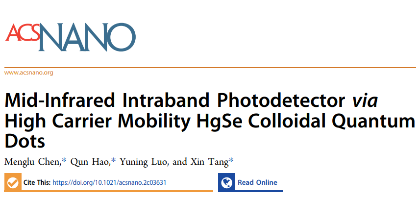 北京理工大學(xué)光電學(xué)院郝群教授團(tuán)隊成員陳夢璐準(zhǔn)聘教授、唐鑫教授在《ACS NANO》期刊上發(fā)表了題為“Mid-Infrared Intraband Photodetector via High Carrier Mobility HgSe Colloidal Quantum Dots”的文章,利用低成本膠體量子點導(dǎo)帶中1Se到1Pe的能級躍遷,實現(xiàn)低成本中波紅外帶內(nèi)躍遷探測。