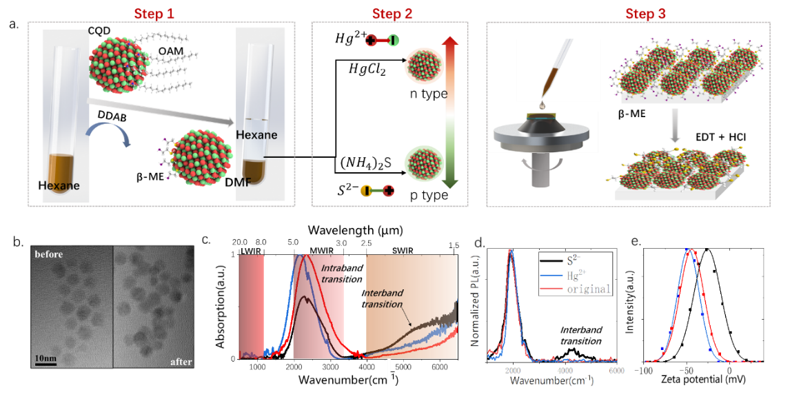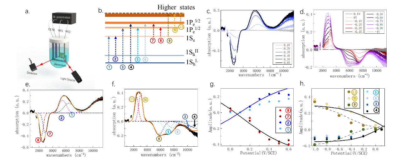帶內(nèi)躍遷紅外材料體系,對摻雜精確調(diào)控和載流子輸運(yùn)控制提出了更高的要求。該工作開發(fā)了帶內(nèi)躍遷膠體量子點混相配體交換方法(圖1),可以有效減小量子點之間的間距,實現(xiàn)表面偶極子摻雜精確調(diào)控,并且使得材料在空氣環(huán)境下穩(wěn)定。并且搭建了光譜電化學(xué)平臺(圖2),獲得精確的HgSe膠體量子點能帶結(jié)構(gòu),證明材料中無明顯缺陷態(tài)。