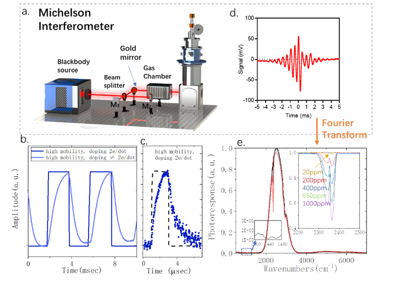 由此制備而成了膠體量子點帶內(nèi)躍遷紅外相機(jī),并成功實現(xiàn)熱成像(圖3)。與低遷移率的帶內(nèi)躍遷膠體量子點探測器相比,該探測器響應(yīng)度提升了55倍,比探測率提升了10倍至1.7×109 Jones。并且可以實現(xiàn)數(shù)微秒的快速響應(yīng)(圖4)。其中波窄帶探測、響應(yīng)速度快的特點,可以實現(xiàn)對溫室氣體的靈敏探測。以CO2為例,結(jié)合邁克爾遜干涉儀, 本文成功結(jié)合實現(xiàn)了探測精度0.25 ppm至2000 ppm的CO2氣體傳感器。