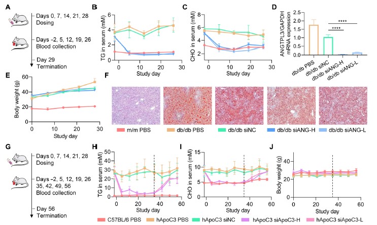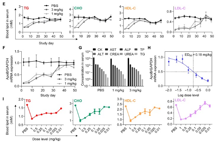 進(jìn)一步,研究人員分別以飼料誘導(dǎo)的高脂血小鼠、db/db轉(zhuǎn)基因小鼠以及人源化載脂蛋白C3(ApoC3)轉(zhuǎn)基因小鼠作為疾病動物模型,模擬了人類由不健康飲食引起的高脂血癥以及單基因表達(dá)異常誘發(fā)的高脂血癥。實(shí)驗(yàn)結(jié)果證明,在經(jīng)過重復(fù)給藥后,0.25mg/kg的siRNA制劑在三種模型中均將疾病動物的血脂水平調(diào)整至與正常動物相當(dāng)?shù)乃健4送猓?.5mg/kg的siRNA在db/db小鼠體內(nèi)實(shí)現(xiàn)了97%的靶標(biāo)mRNA表達(dá)下調(diào)。在轉(zhuǎn)基因動物中,血脂水平在停藥后4周后回復(fù)到治療前。總的來說,由iLAND遞送的siRNA極為高效地抑制了靶標(biāo)mRNA的表達(dá),進(jìn)而帶來了十分積極的降血脂治療效果。