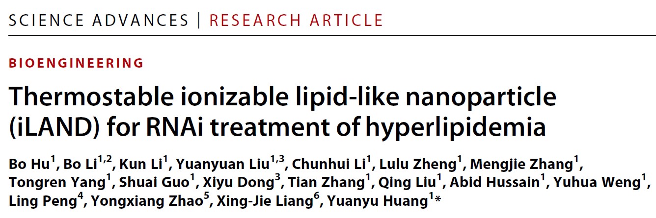 近日,北京理工大學(xué)前沿交叉科學(xué)研究院黃淵余課題組在新型可電離脂質(zhì)的核酸遞送載體以及降血脂siRNA藥物研究方面取得重要研究進(jìn)展。該成果以《Thermostable ionizable lipid-like nanoparticle (iLAND) for RNAi treatment of hyperlipidemia》為題發(fā)表于《Science Advances》(IF= 14.136)。該論文第一作者為北京理工大學(xué)生命學(xué)院/前沿交叉科學(xué)研究院博士研究生胡泊,通訊作者為黃淵余教授。前沿交叉院李博副研究員、梁興杰兼職教授等亦參與了研究和討論。
