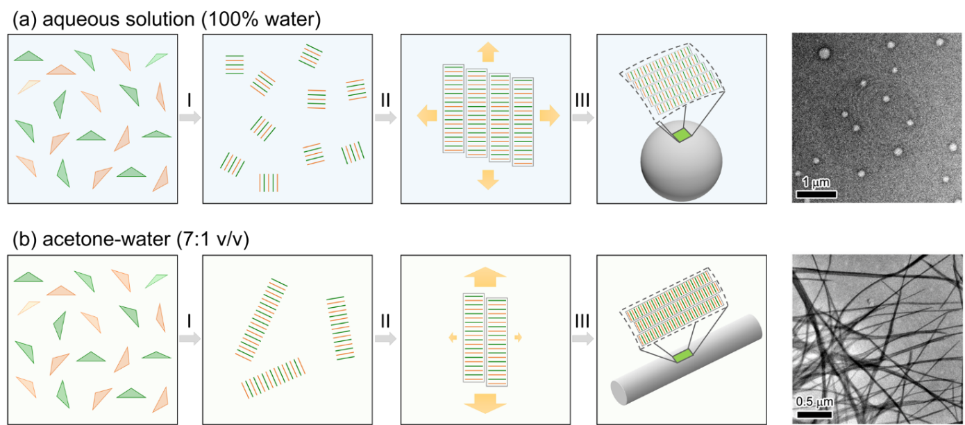 綜合上述研究結(jié)果,該研究提出了不同溶劑環(huán)境下PtB的分子組裝機理:在水溶液疏水相互作用占主導(dǎo)地位,具有方向性的Pt···Pt與π-π相互作用較弱,PtB采取等鏈生長機制,形成球形的囊泡;在丙酮和水混合溶液中,Pt···Pt與π-π的定向誘導(dǎo)作用占主導(dǎo),疏水相互作用減弱,傾向于以成核增長機制生長,形成納米纖維。該工作將理論計算與實驗有機結(jié)合,為Pt(II)配合物作為超分子構(gòu)筑基元的功能材料設(shè)計和自組裝過程的精確控制提供了理論依據(jù),所開發(fā)的力場參數(shù)也廣泛適用于其他Pt(II)配合物的組裝過程的模擬。
