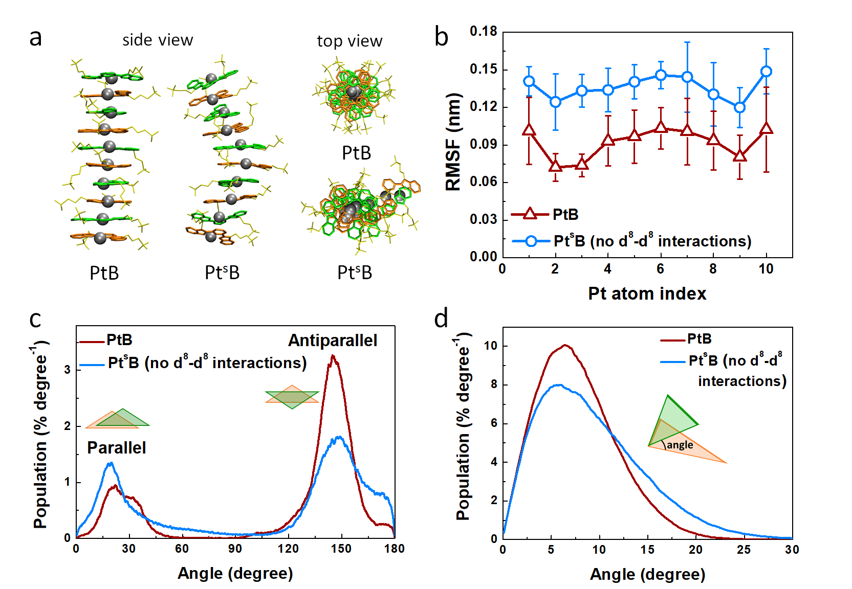 接著,基于新開發(fā)的力場參數(shù)采用分子動力學(xué)模擬,作者考慮了PtB體系、不含d8-d8相互作用的PtsB體系和去掉Pt(II)的Pt-free三種體系的分子組裝過程,模擬結(jié)果表明,PtB對應(yīng)十聚體組裝結(jié)構(gòu)緊致有序;PtsB對應(yīng)十聚體松散彎曲;而Pt-free體系則是無歸團聚(圖4)??隙薖t···Pt與π-π相互作用在驅(qū)動Pt(II)配合物組裝過程和誘導(dǎo)有序結(jié)構(gòu)形成中的重要作用。
