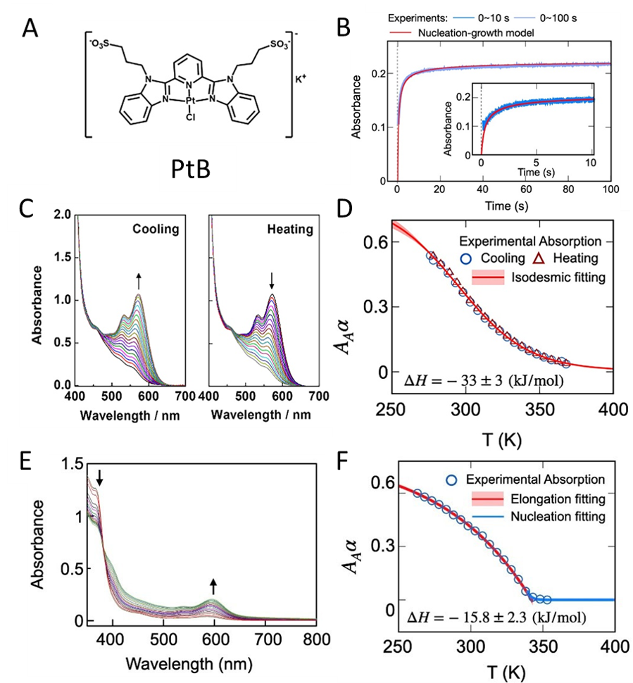 北京理工大學(xué)化學(xué)與化工學(xué)院李澤生教授團隊的鄭小燕副研究員、香港科技大學(xué)的黃旭輝教授和香港大學(xué)的任詠華院士合作對不同溶劑環(huán)境下兩親性Pt(II)配合物PtB的分子組裝機制進行了系統(tǒng)的研究。由于分子間Pt···Pt相互作用會產(chǎn)生新的光譜信號,通過變溫紫外可見光譜可獲取平衡態(tài)PtB的組裝體相對于單體的比例(α)隨溫度的變化,作者分別通過等鍵模型(Isodesmic model)和成核增長模型(Nucleation-Elongation model)擬合不同溶劑下PtB的α-T曲線來探索其分子組裝體生長機制。研究發(fā)現(xiàn):在純水溶液中,α-T曲線符合等鍵增長模型,所得平衡常數(shù)分別為Ke300K = 2.4×103 M-1和Ke368K = 2.6×102 M-1;在丙酮和水混合溶液中,α-T曲線符合成核增長模型,所得平衡常數(shù)為Ke298K = 2.6×103 M-1和Ke328K = 1.4×102 M-1。同時成核過程對應(yīng)的平衡常數(shù)為5.0×10-6。此外,作者通過Stopped-flow吸收光譜實驗測定了PtB在丙酮和水混合溶液中的組裝過程動力學(xué)。結(jié)果發(fā)現(xiàn),實驗數(shù)據(jù)符合成核增長模型:在t="0.1s時,PtB具有1.1×10-6 M s-1的成核速率,隨后成核速率急劇下降直至1.0 s時幾乎可忽略不計。在t="0.1s時,PtB的生長速率為10.6" s-1,隨著PtB單體被消耗和分子組裝體間的融合,其生長速率逐漸降低。這一結(jié)果表明PtB在丙酮和水混合物溶液中的組裝過程符合成核增長形成機制。